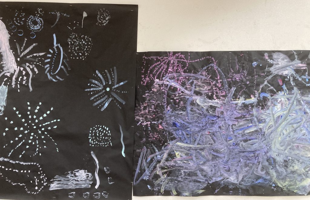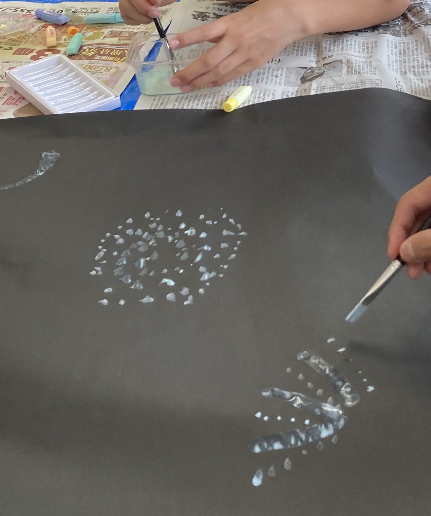 大きな黒い用紙に、絵の具で花火を描いて行きます。