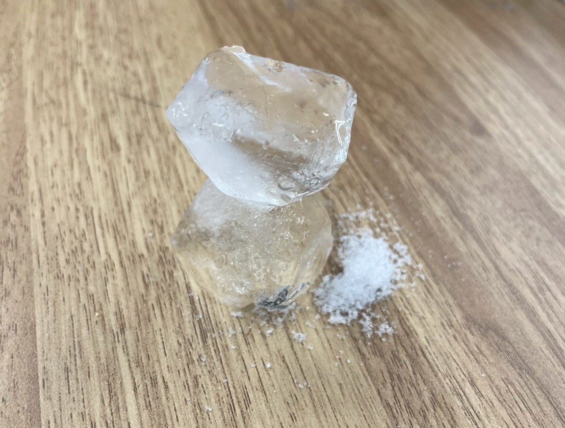 氷に塩を振りかけ、その上にもう一つの氷をのせると、なんと、ピタッとくっつきました!