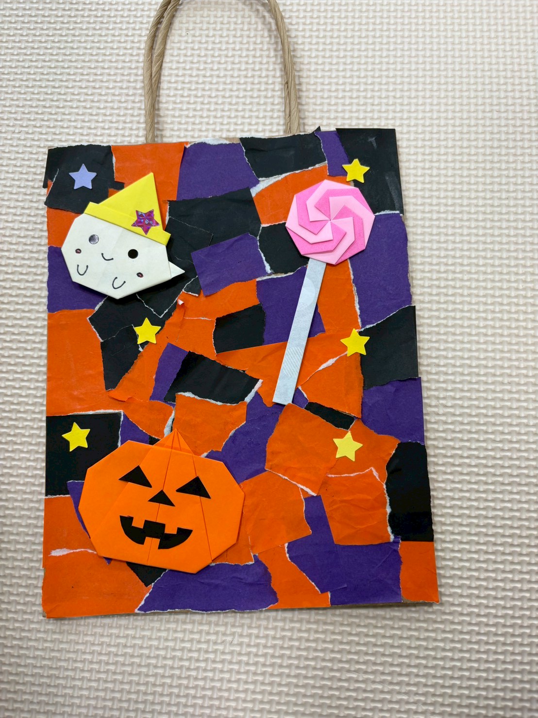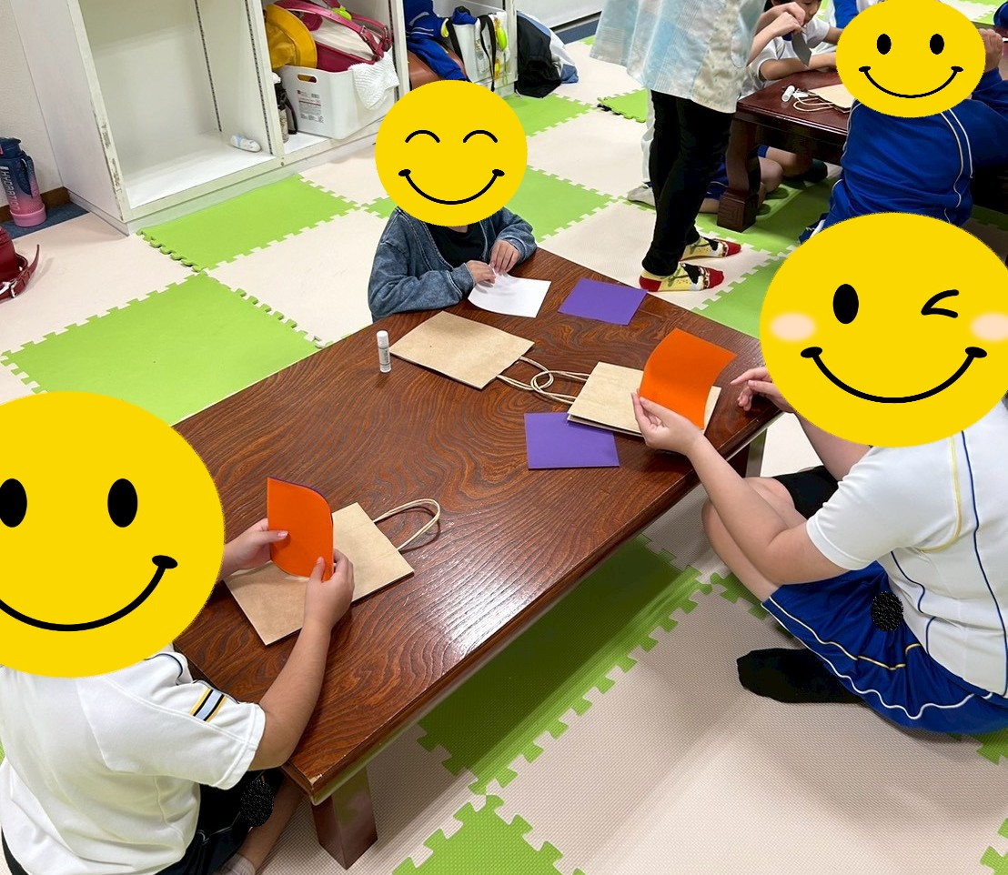 紙袋に折り紙で作ったお化けやカボチャ、キャンディー等を可愛らしく飾り付けをして、それぞれ楽しく作っていました!(^^)!