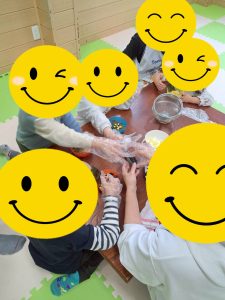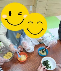 みんなでゆで卵の殻を割って、ワカメを解したり、缶詰からコーンをボールの中に入れて用意をしてもらいました。