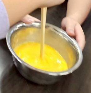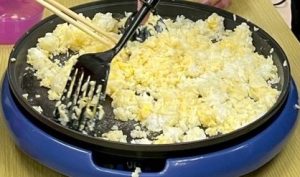 まずは玉子を溶き、ホットプレートに流し込んだら、ご飯とあえて炒めていきます。