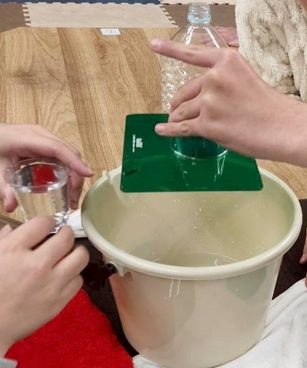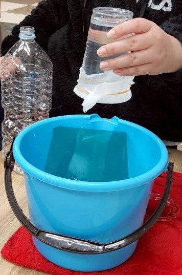 こちらは布を使っての実験です。柔らかい材質でも、水がこぼれずますますビックリの子供たちでした。