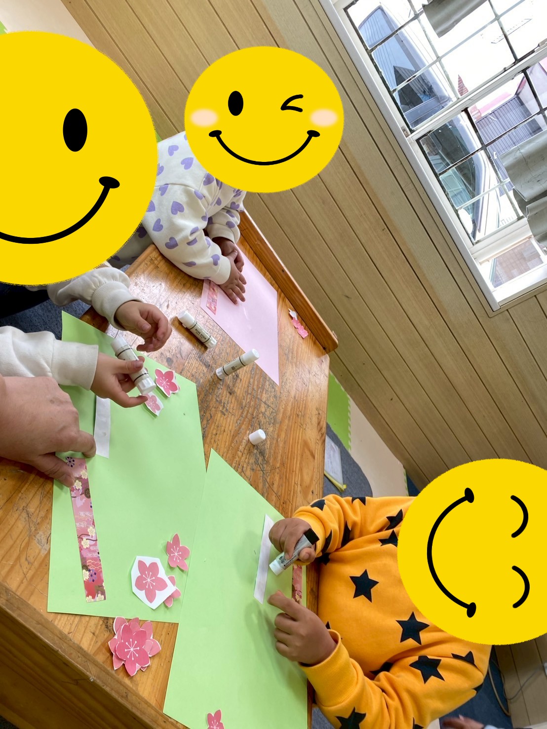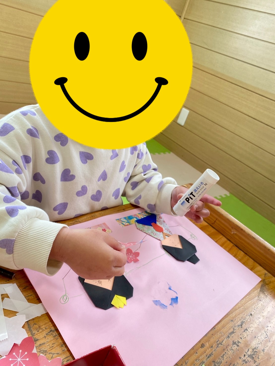 ひな祭りの制作をしました。画用紙に折り紙で作ったお内裏様とお姫様をのりで貼って、顔を描いて飾り付けをしました☆