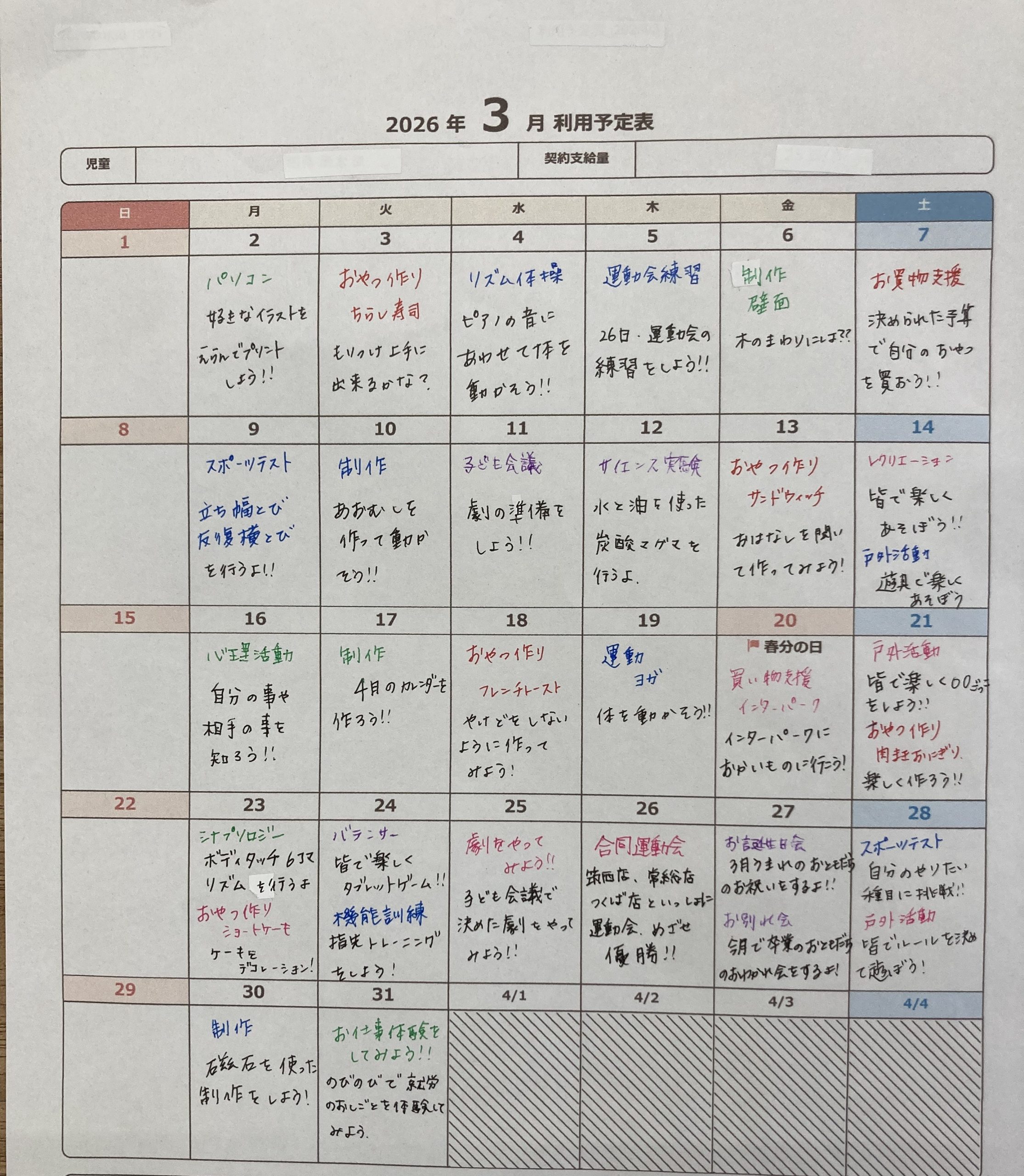 今月は27日に、4店舗合同での運動会があります。子供たちも、当日に向けて練習中です! その他にも、春休みには劇やお仕事体験など、楽しい活動盛りだくさんでお待ちしています☆彡